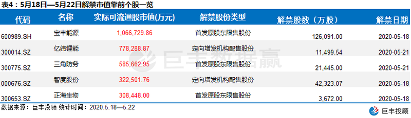 解禁市值超过30亿元以上的个股有5家,其中宝丰能源解禁市值超过100亿元。