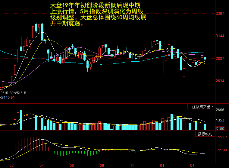 大盘19年第一季度的上涨行情转变为围绕60周均线的中期震荡行情。受外围暴跌影响,大盘短线走弱带动周线MACD黄白线将进入零轴下方,不过预计无需紧张,很大可能只是蜻蜓点水。
