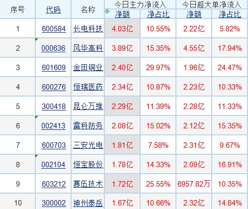从个股主力资金流向来看,长电科技获得主力资金净流入4.03亿,风华高科获主力资金3.89亿净流入,金田铜业获主力资金净流入2.40亿,恒瑞医药获主力资金净流入2.34亿,昆仑万维获主力资金净流入2.29亿。