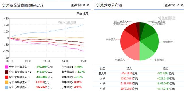 从两市资金流向来看,截止收盘沪深两市呈现主力资金净流出的状态,当日沪深两市资金净流出302.80亿元。今日超大单净流出113.80亿元,大单净流出189.00亿元,中单净流入0.59亿元,小单净流入302.20亿元。