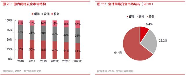 2018 年全球网络安全市场结构中,安全服务占比达到64.4%,头部安全厂商提供的安全服务以订阅化服务为主。而同期我国网络安全市场结构中安全硬件占比接近一半,安全服务占比仅为14%,随着虚拟化及云服务理念的渗透,企业对于持续性的安全服务需求逐渐增加,安全服务占比将逐渐提升。