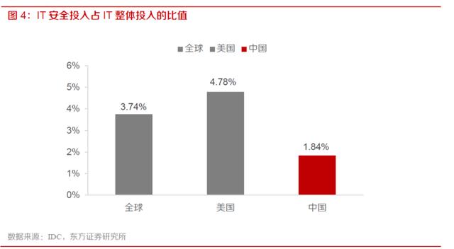 相对于美国和全球平均水平,我国IT 安全投入占IT 整体投入的比例较低,未来我国IT 安全投入有望加大。从IT 安全投入占IT 整体投入的比例看,全球平均水平在3.74%,美国为4.78%,而我国仅为1.84%。