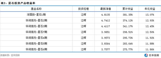 最出色的产品——深国投-星石1期,投资经理江晖,累计回报率达到381.35%,复合收益率13.07%,大幅超越沪深300同期-11.28%的回报率。