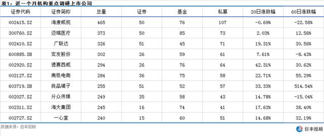 海康威视、迈瑞医疗、广联达、宏发股份等上市公司是近一个月机构重点调研的公司。