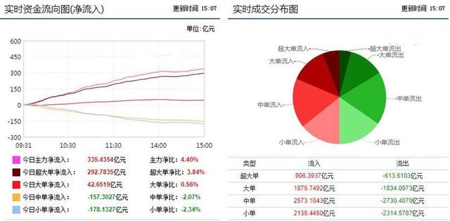 从两市主力资金流向来看,截止收盘,沪深两市主力资金呈现大幅净流入状态,两市共流入335.4354亿元。其中,超大单净流入292.7835亿元,大单净流入42.6519亿元,中单净流出157.3027亿,小单净流出178.1327亿元。