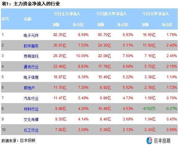 从两市行业板块资金流向来看,电子元件获主力资金净流入82.35亿,软件服务行业主力资金净流入35.81亿,券商信托板块主力净流入29.25亿,通讯行业主力资金净流入23.49亿,电子信息行业获主力净流入18.87亿。