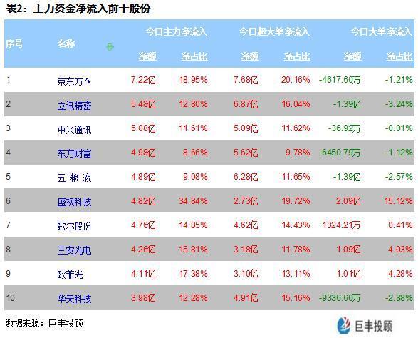 从两市个股主力资金流向来看,京东方A获得主力资金净流入7.22亿,立讯精密获主力资金5.48亿净流入,中兴通讯获主力资金净流入5.08亿,东方财富获主力资金净流入4.98亿,五粮液获主力资金净流入4.89亿,盛视科技获主力4.82亿净流入。