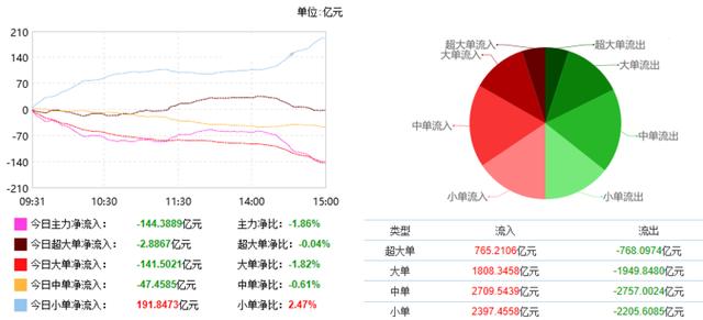 根据东财统计,截止收盘沪深两市呈现资金净流出状态,当日沪深两市资金净流出144.39亿元,今日超大单净流出2.89亿元,大单净流出141.50亿元,中单净流出47.46亿元,小单净流入191.85亿元。