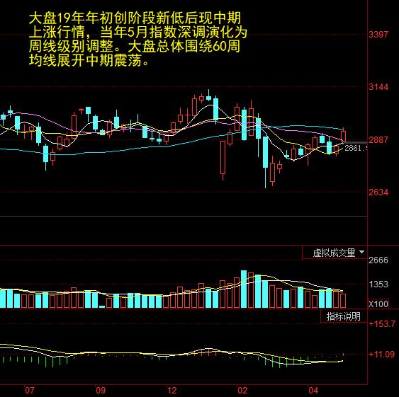 大盘19年第一季度的上涨行情转变为围绕60周均线的中期震荡行情。受外围暴跌影响,大盘强势震荡转为弱势,周线MACD黄白线进入零轴下方,近期反弹MACD黄白线形成零下金叉。