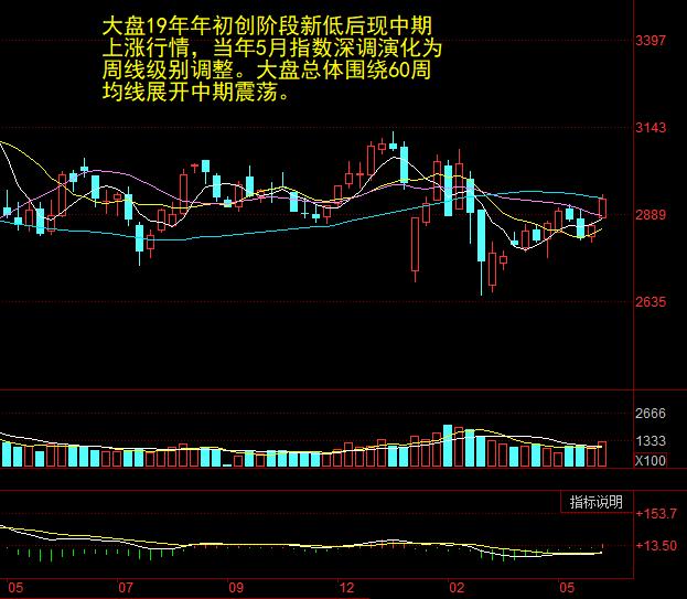 大盘19年第一季度的上涨行情转变为围绕60周均线的中期震荡行情。受外围暴跌影响,大盘强势震荡转为弱势,周线MACD黄白线进入零轴下方,近期反弹MACD黄白线形成零下金叉。