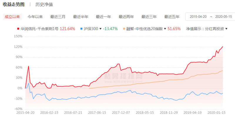 最出色的产品——华润信托-千合紫荆1号,投资经理崔同魁,累计回报率达到121.64%,复合收益率16.99%,大幅超越沪深300同期-13.47%的回报率。