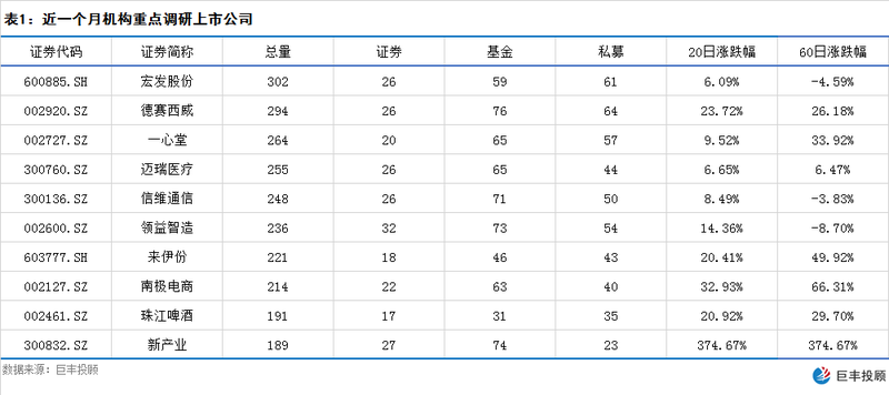 宏发股份、德赛西威、一心堂、迈瑞医疗等上市公司是近一个月机构重点调研的公司。