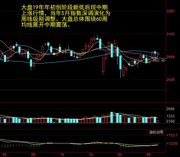 大盘19年第一季度的上涨行情转变为围绕60周均线的中期震荡行情。受外围暴跌影响,大盘强势震荡转为弱势,周线MACD黄白线进入零轴下方,近期反弹MACD黄白线形成零下金叉。