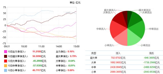 根据东财统计,截止收盘沪深两市呈现资金净流入状态,当日沪深两市资金净流入11.22亿元,今日超大单净流入56.51亿元,大单净流出45.29亿元,中单净流出57.93亿元,小单净流入46.71亿元。
