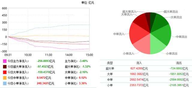根据东财统计,截止收盘沪深两市呈现资金净流出状态,当日沪深两市资金净流出256.89亿元,今日超大单净流出97.45亿元,大单净流出159.44亿元,中单净流入8.55亿元,小单净流入248.34亿元。