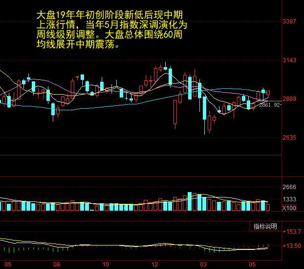 大盘19年第一季度的上涨行情转变为围绕60周均线的中期震荡行情。受外围暴跌影响,大盘强势震荡转为弱势,周线MACD黄白线进入零轴下方,近期反弹MACD黄白线形成零下金叉。