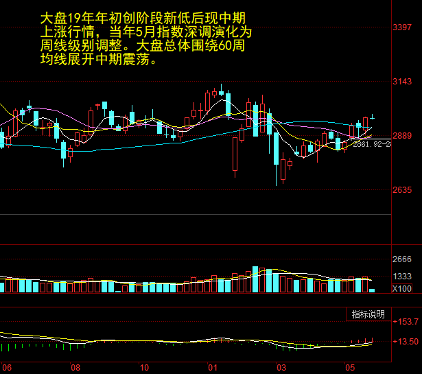 大盘19年第一季度的上涨行情转变为围绕60周均线的中期震荡行情。受外围暴跌影响,大盘强势震荡转为弱势,周线MACD黄白线进入零轴下方,近期反弹MACD黄白线形成零下金叉。