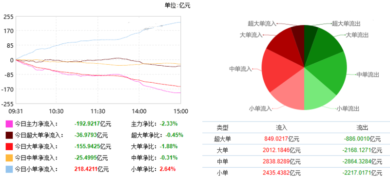 根据东财统计,截止收盘沪深两市呈现资金净流出状态,当日沪深两市资金净流出192.92亿元,今日超大单净流出36.98亿元,大单净流出155.94亿元,中单净流出25.50亿元,小单净流入218.42亿元。