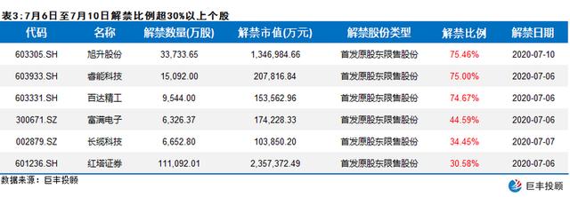解禁市值超过30亿元以上的个股仅2家,为红塔证券和旭升股份,解禁市值分别为235.7亿元和134.7亿元。