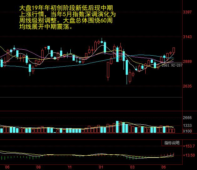 大盘19年第一季度的上涨行情转变为围绕60周均线的中期震荡行情。受外围暴跌影响,大盘强势震荡转为弱势,周线MACD黄白线进入零轴下方,近期反弹MACD黄白线形成零下金叉。
