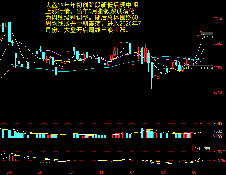 大盘19年第一季度的上涨行情转变为围绕60周均线的中期震荡行情,现进入周线第三浪上涨行情。