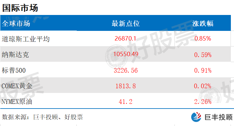 道指涨227.51点,或0.85%,报26870.10点;纳指涨61.92点,或0.59%,报10550.49点;标普500指数涨29.04点,或0.91%,报3226.56点。