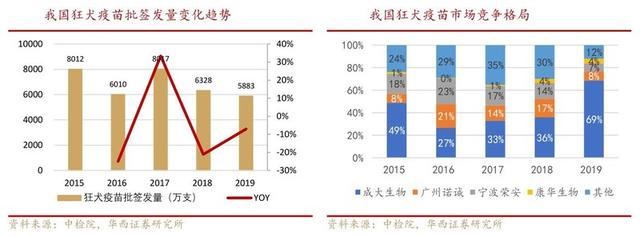 根据中国产业信息网数据,2017年我国宠物数量由2010年的9,791万只大幅增加至1.68亿只,随宠物市场规模的扩大、暴露前免疫知识的普及,人用狂犬病疫苗仍有需求增长空间。中国狂犬疫苗市场集中度高,主要产品均来自国内企业。
