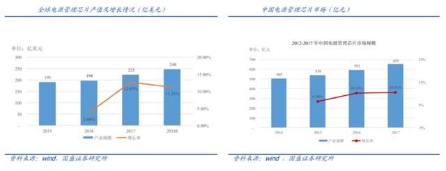 电源管理芯片市场保持较高增速。根据Semiconductor统计,2015--2017年全球电源管理芯片产值分别为191亿美元、198亿美元、223亿美元,2016 和2017年较上一年同比增长3.66%、12.63%。