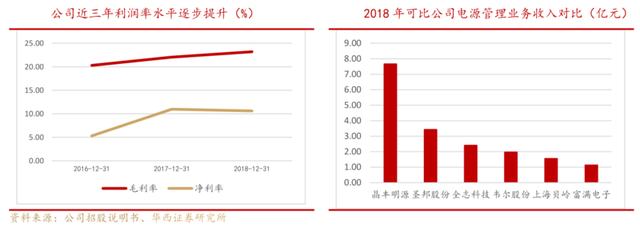 同行竞争来看,公司收入规模名列前茅。以 2018年数据为例,圣邦股份、全志科技、韦尔股份、上海贝岭和富满电子等电源管理芯片业务收入分别为3.44亿元、2.41亿元、1.97亿元、1.56亿元、1.13亿元,远低于晶丰明源同期数据。