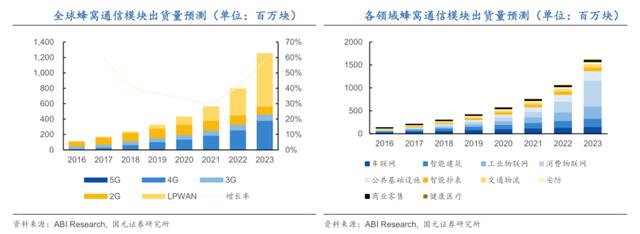 广域物联网通信设备目前以蜂窝通信为主导,通过蜂窝通信模块连入2G/3G/4G/5G/NB-IoT 等公共网络,应用场景包括工业物联网、智慧城市、智能抄表、车联网等诸多领域。