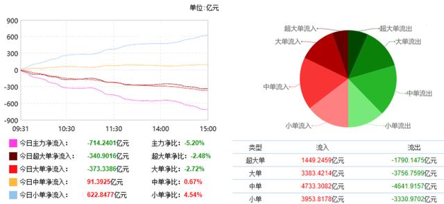 根据东财统计,截止收盘沪深两市呈现资金净流出状态,当日沪深两市资金净流出714.24亿元,今日超大单净流出340.90亿元,大单净流出373.34亿元,中单净流入91.39元,小单净流入622.85元。