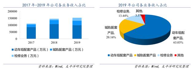 动车组配套产品销售收入占比超60%。2017 -2019年动车组配套产品收入分别占公司总收入的77%、72%、63%,虽然呈现下降态势,但仍然是公司收入重要来源。同期城轨车辆配套产品收入占比从17%提高到20%,检修业务由于基数较小则从占比5%迅速提升至13%。