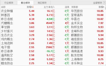 农业板块(覆盖农业种植、转基因、代糖概念、乡村振兴、生态农业、鸡肉概念、土地流转、猪肉概念、蝗虫防治、草甘膦等概念)走强:神农科技、农发种业、华茂股份、苏垦农发、亚盛集团、荃银高科、金健米业涨停,东方集团、丰乐种业、万向德农、龙大肉食、隆平高科、北大荒、登海种业、隆平高科、大北农、厦门象屿、新农开发、莫高股份、众兴菌业涨5%。