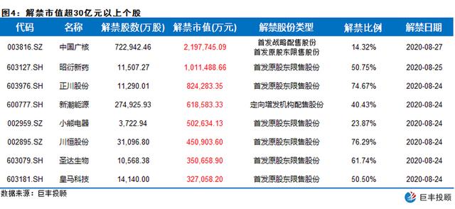 解禁市值超过30亿元以上的个股有8家,其中中国广核和昭衍新药解禁市值靠前,分别为219亿元和101亿元,解禁压力较大。
