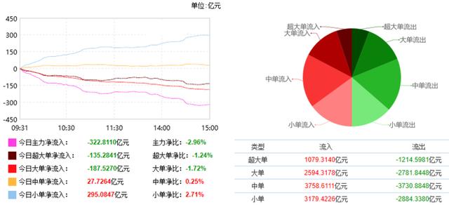 根据东财统计,截止收盘沪深两市呈现资金净流出状态,当日沪深两市资金净流出322.81亿元,今日超大单净流出135.28亿元,大单净流出184.53亿元,中单净流入27.73亿元,小单净流入295.08亿元。
