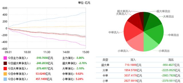 根据东财统计,截止收盘沪深两市呈现资金净流出状态,当日沪深两市资金净流出510.77亿元,今日超大单净流出240.28亿元,大单净流出270.48亿元,中单净流入53.62亿元,小单净流入457.14亿元。