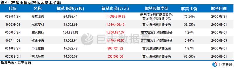 解禁市值超过30亿元以上的个股有6家,其中韦尔股份和光威复材解禁市值靠前,分别为1100亿元和154亿元,解禁压力较大。