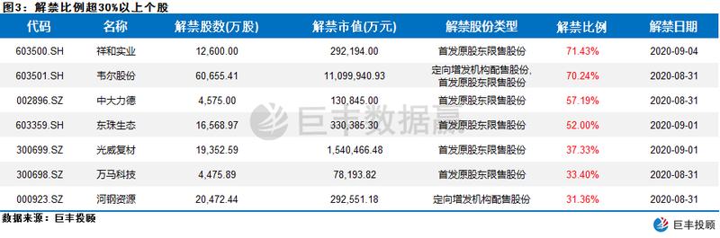 从当周解禁市值分布看,高峰期主要集中在周一。个股方面,解禁比例超过30%的有7家,其中解禁比例较大的个股主要有祥和实业和韦尔股份等。