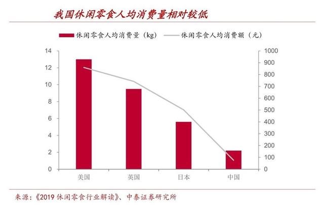 与发达国家相比,我国休闲零食人均消费仍有较大提升空间。目前中国休闲零食人均消费量为2.2kg,人均消费额为75.3 元,而美国、英国人均消费量分别为13kg和9.5kg,人均销售额分别为860元和740元,我国与发达国家相比存在很大差距,消费结构处于较为初级的阶段,休闲零食市场仍存在较大增长空间。未来随着中国居民整体消费结构的不断升级,休闲零食人均消费有望持续提升。