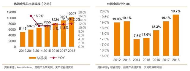 我国休闲食品行业长期维持较高增速,各个细分品类发展均较快。Frost&Sullivan 数据显示,2012-2018年我国休闲食品行业规模由5145亿元上升至10297亿元,CAGR为12.2%,从中商产业研究院数据来看,休闲食品中糖果蜜饯和烘焙的规模相对较大,品类增速整体较快,2015-2020 年休闲卤制品、糖果及蜜饯、烘焙、膨化、炒货及饼干的 CAGR 预测依次为24.1%、12.5%、14.4%、21.2%、13.4%、12.4%。