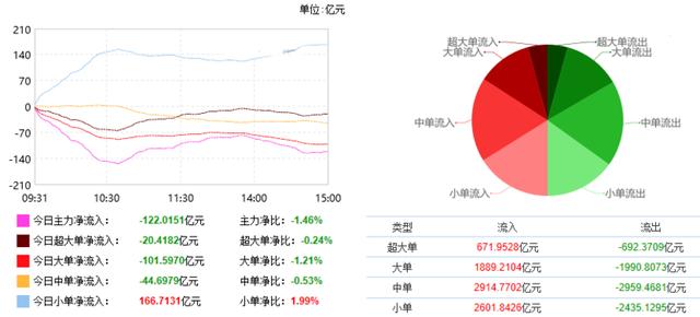 根据东财统计,截止收盘沪深两市呈现资金净流出状态,当日沪深两市资金净流出122.02亿元,今日超大单净流出20.42亿元,大单净流出101.60亿元,中单净流出44.70亿元,小单净流入166.71亿元。