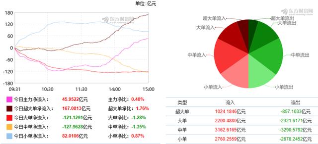 根据东财统计,截止收盘沪深两市呈现资金净流入状态,当日沪深两市资金净流入45.95亿元,今日超大单净流入167.08亿元,大单净流出121.13亿元,中单净流出127.96亿元,小单净流入82.01亿元。