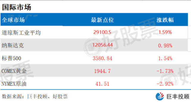 道指收盘上涨454.84点,或1.59%,报29100.50点;纳指涨116.78点,或0.98%,报12056.44点;标普500指数涨54.19点,或1.54%,报3580.84点。