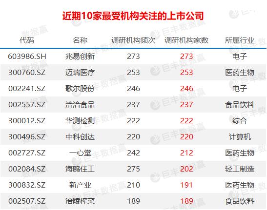 从个股数据看,宏发股份和兆易创新等十家公司受机构调研次数最多,最受关注。