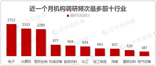 从行业调研数据上看,本周机构重点调研电子、计算机和医药生物等行业,从总量看,电子最受机构关注,调研总量达2722次,其次是计算机行业调研总量为2333次,医药生物行业调研总量为2289次,另外还有诸多行业受到机构密集调研。