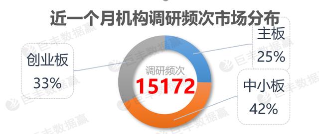 从板块上看,近一月机构调研频次最多的是中小板上市公司,占比为42%,其次是创业板上市公司,占比33%,最后是主板上市公司,占比为25%。