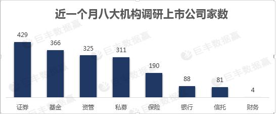 从机构活跃度来看,本周证券公司调研最为活跃,共调研429次,其次是基金公司,调研次数达到366次,另外资管和私募调研数据也比较靠前,分别为325次和311次。