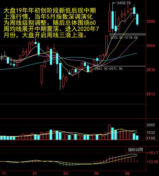 大盘19年第一季度的上涨行情转变为围绕60周均线的中期震荡行情,现进入周线第三浪上涨行情。