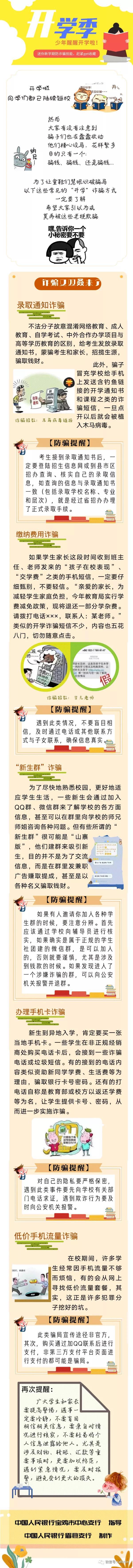 又是一年开学季,各类诈骗分子也蠢蠢欲动起来,为进一步提升广大群众金融安全意识,防止落入骗子圈套,小编特意梳理了一些典型的诈骗形式,为大家送上一份开学防诈骗指南,请家长和同学们收好!