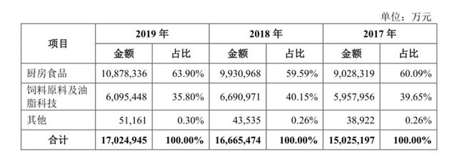 公司业务主要包括厨房食品和饲料原料及油脂科技产品。2019年,公司厨房食品板块实现营收1087.83亿元,同比增9.54%,保持稳定增长,占营收比重约为61%,为公司重点布局板块。公司运用“循环经济”理念,拓展产业领域,提升附加值。